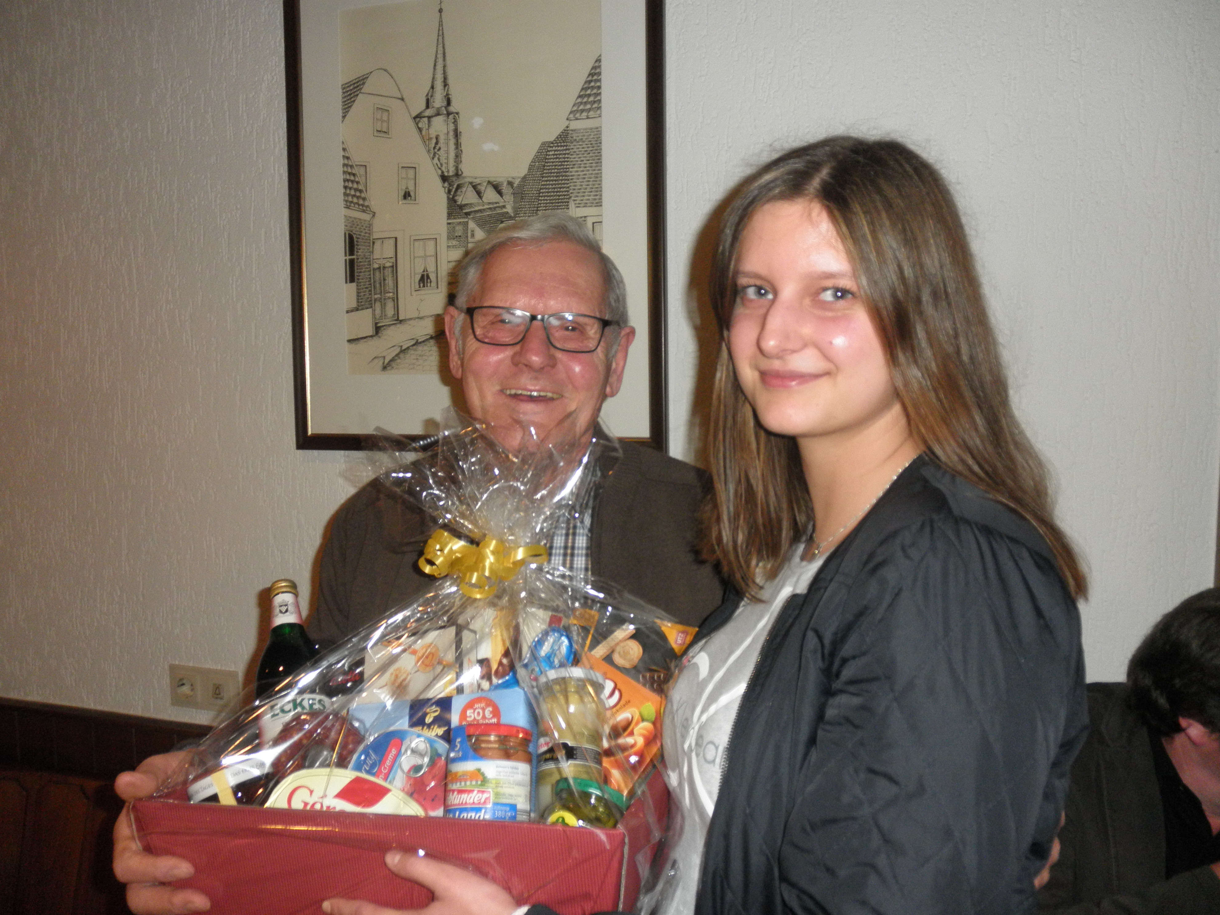 Das Foto zeigt Cayley Kuipers, die neugewählte Schriftführerin, die sich im Namen der Mitglieder des RGZV Stadtlohns bei Eckart Ballenthin mit einem Präsent für 24 Jahre geleistete Vorstandsarbeit bedankt.